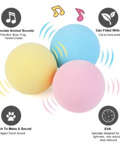 The seller recommends ordering plush style, it is more durable Product Specifications Cat toy sounding ball, with a diameter of 50mm (1.97in), using high-quality and durable EVA/Plush Each Toys built-in LR44 Lithium battery cell and high-sensitivity sounder, which can produce different simulated sounds Simulate the real sounds of three different animals to attract cats’ attention and stimulate cat’s hunting nature. The sounds of balls of different colors are different. blue~frog sound yellow~cricket sound pink~bird sound. The cat toy ball has a built-in high-sensitivity sounder. As long as the cat’s paw slightly touches the ball, it will make a sound. Cat ball toys with funny animal sounds can reduce boredom and increase your cat’s activity, thus bringing more fun to your cat. After opening the lid, you can add catnip to the ball. It can make your cat feel excited and happy, and become the cat’s favorite toy. It can encourage the cat to exercise, stimulate the cat’s thinking or accompany the cat, allowing your cat to exercise and stay healthy. Note To prevent kittens from swallowing old batteries, the battery is built into the toy and cannot be replaced.